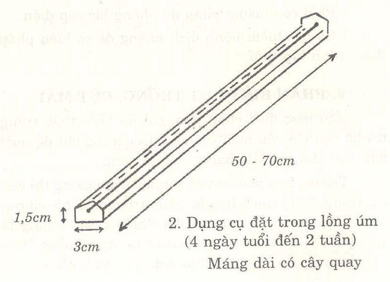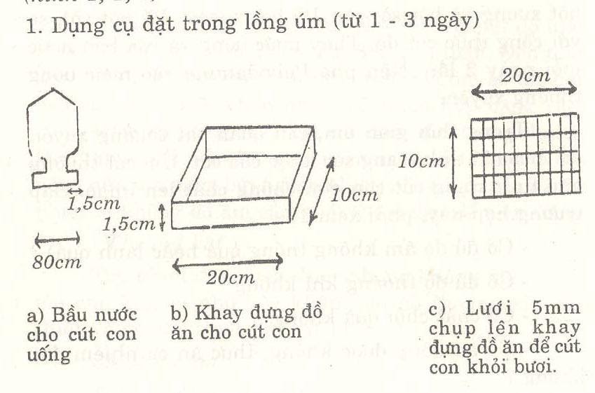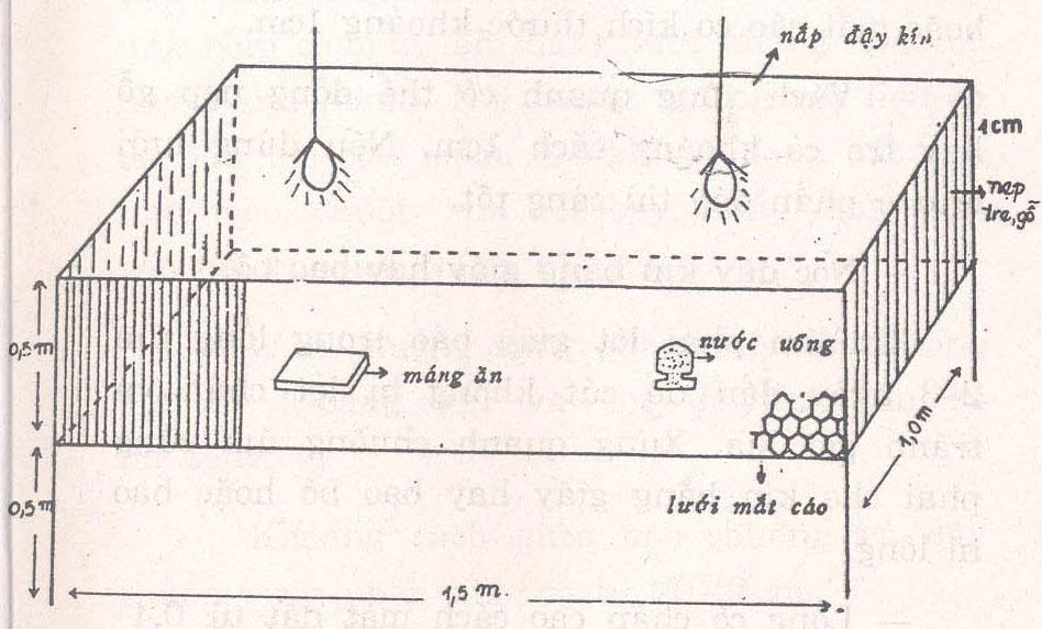 Lồng úm: Quy cách 1,5 x 1,0 x 0,5m, cách mặt đất 0,5m. Xung quanh làm bằng lưới ô vuông 1cm hoặc bằng nẹp tre gỗ. Những ngày đầu mới úm, đáy lồng và xung quanh phải lót giấy, che kín, yên tĩnh và không bị lọt chân.